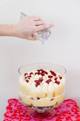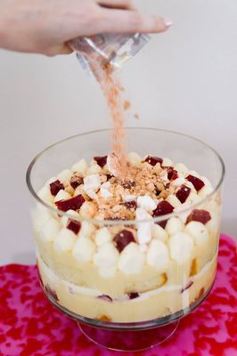 Layers of gin soaked sponge cake, vanilla bean custard, whipped cream, macerated strawberries and real raspberry jelly. Topped with whipped mascarpone cream and comes with crushed meringues and strawberry milk crumb to garnish at home.