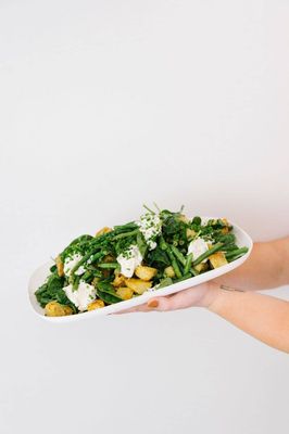 Mustard potato and green bean with garlic sour cream dressing, topped with chives.