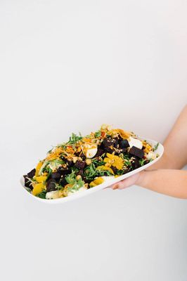 Roasted beet, pickled fennel and orange with feta whip. Topped with toasty chopped hazelnuts.